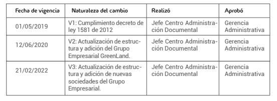 Cualquier cambio sustancial, actualización, supresión o rectificación contemplado en la presente política será informado, antes de su implementación, a los Titulares de los Datos Personales a través de la página web de GreenLand en la sección conózcanos, y al interior del Grupo a través de la Intranet, para informar a través de este el cambio realizado a los intermediarios, proveedores y terceros que correspondan. Adicionalmente, se podrá utilizar cualquier medio que permita informar de manera eficiente dicho cambio. El Grupo GreenLand se reserva el derecho de modificar la política de Protección de Datos Personales en cualquier momento.